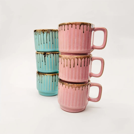 Blue & Pink Drip Design Ceramic Tea Cups (Set of 6)